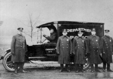 During the 1920’s, Endicott’s population grew quickly due to the E-J Corporation, which employed an estimated 20,000 people in Endicott, Johnson City and Binghamton factories. As the era of the “horseless carriage” evolved, the police department continued to grow and also began using automobiles.