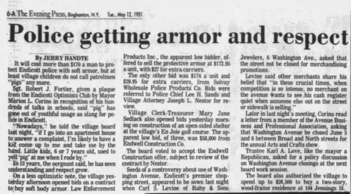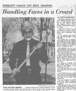 Chief Lee H. Sands took the reins of the department from Chief Pembridge in 1977. During Chief Sands’ tenure, officers in the department benefitted from a county-wide radio system installed to allow officers to communicate with one another. Youth were invited into the police department to participate in the Endicott Police Junior Rifle Club that had been in existence for decades, teaching youth firearms and marksmanship skills. Also during Chief Sands’ time in office, police officers of the department were outfitted with body armor for the first time.